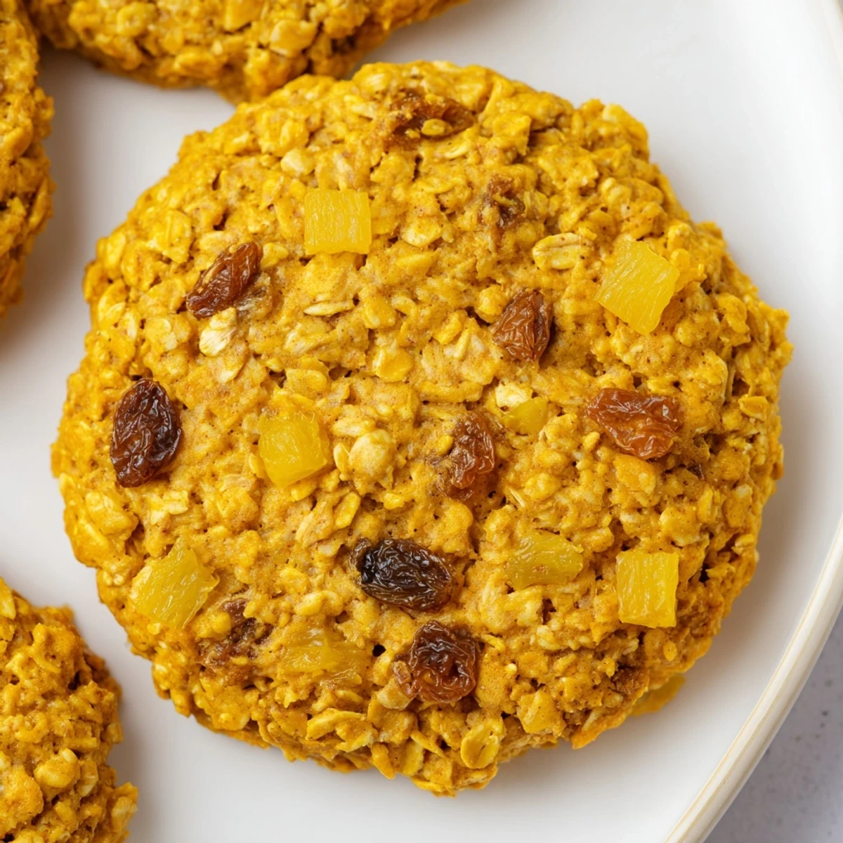Each bite offers chewy texture from plump raisins and dried pineapple pieces, with the earthy warmth of turmeric balancing the natural fruit sweetness. The result is a golden-edged cookie that's perfect for snacking, dessert, or even breakfast.